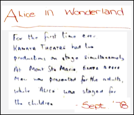 There were four performances at the Earl of March plus one at Mont Ste-Marie. This was the first time Kanata Theatre had two productions on stage simultaneously: Alice and Enter a Free Man.